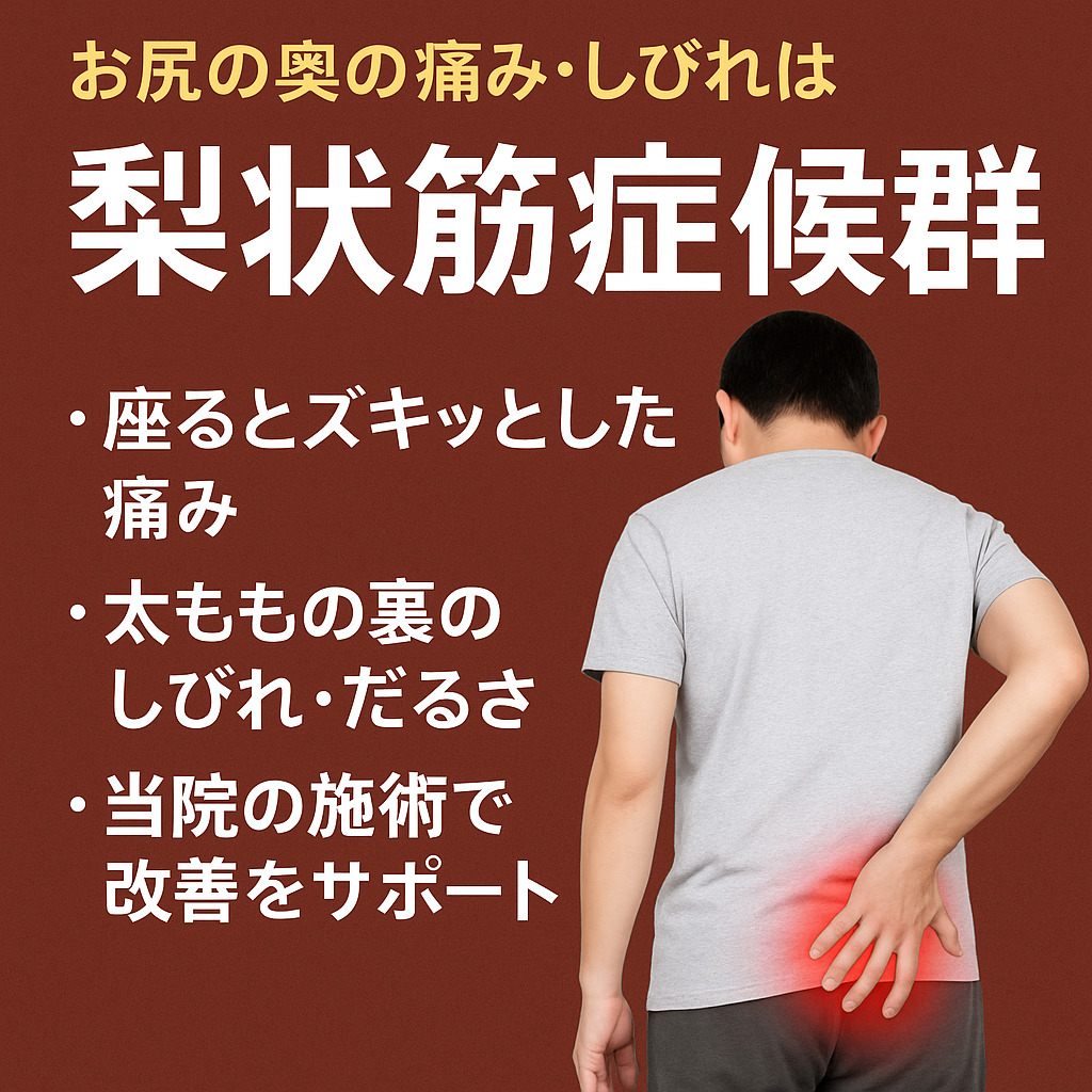 骨盤の奥にある“梨状筋”が硬くなり、坐骨神経を圧迫することで起こる症状です。